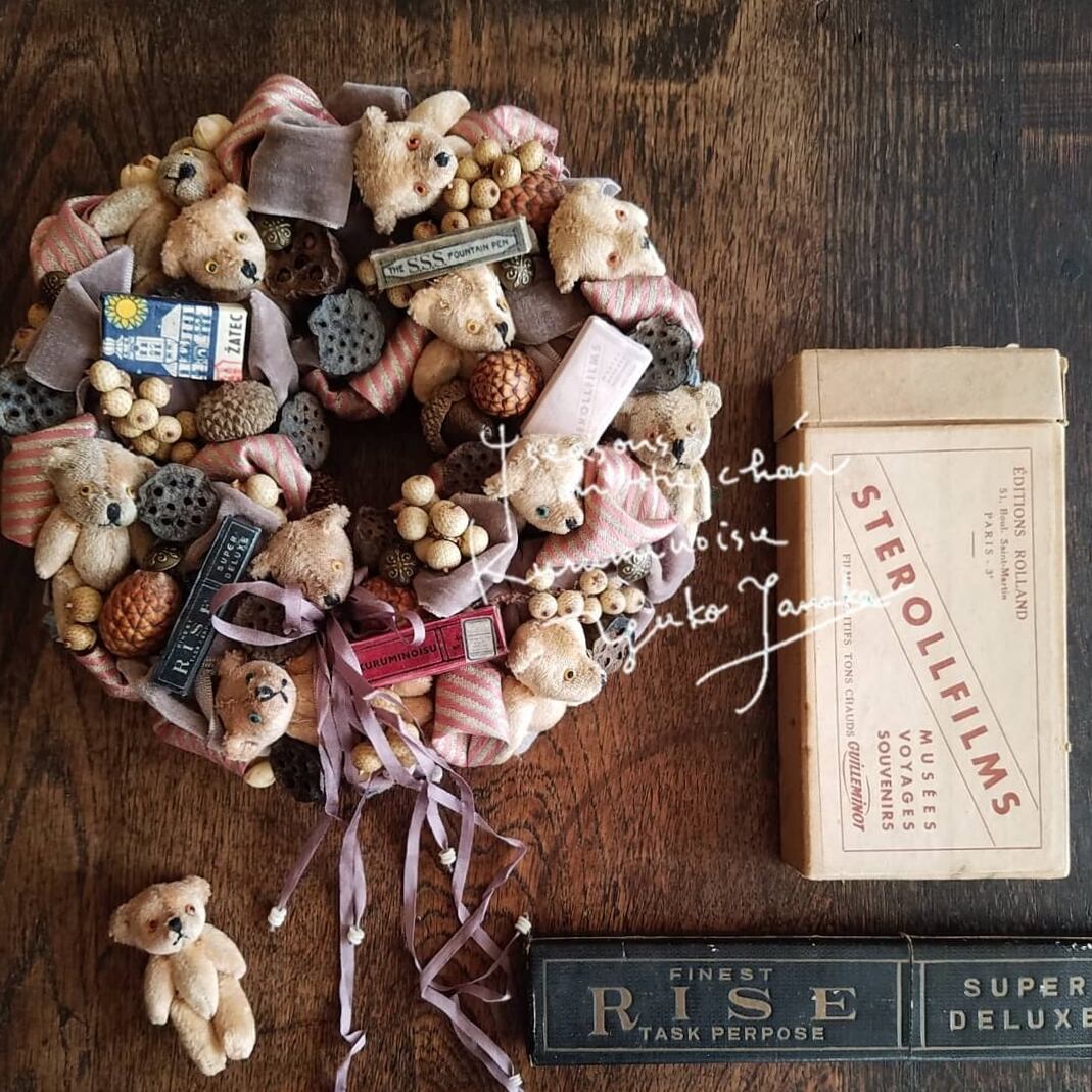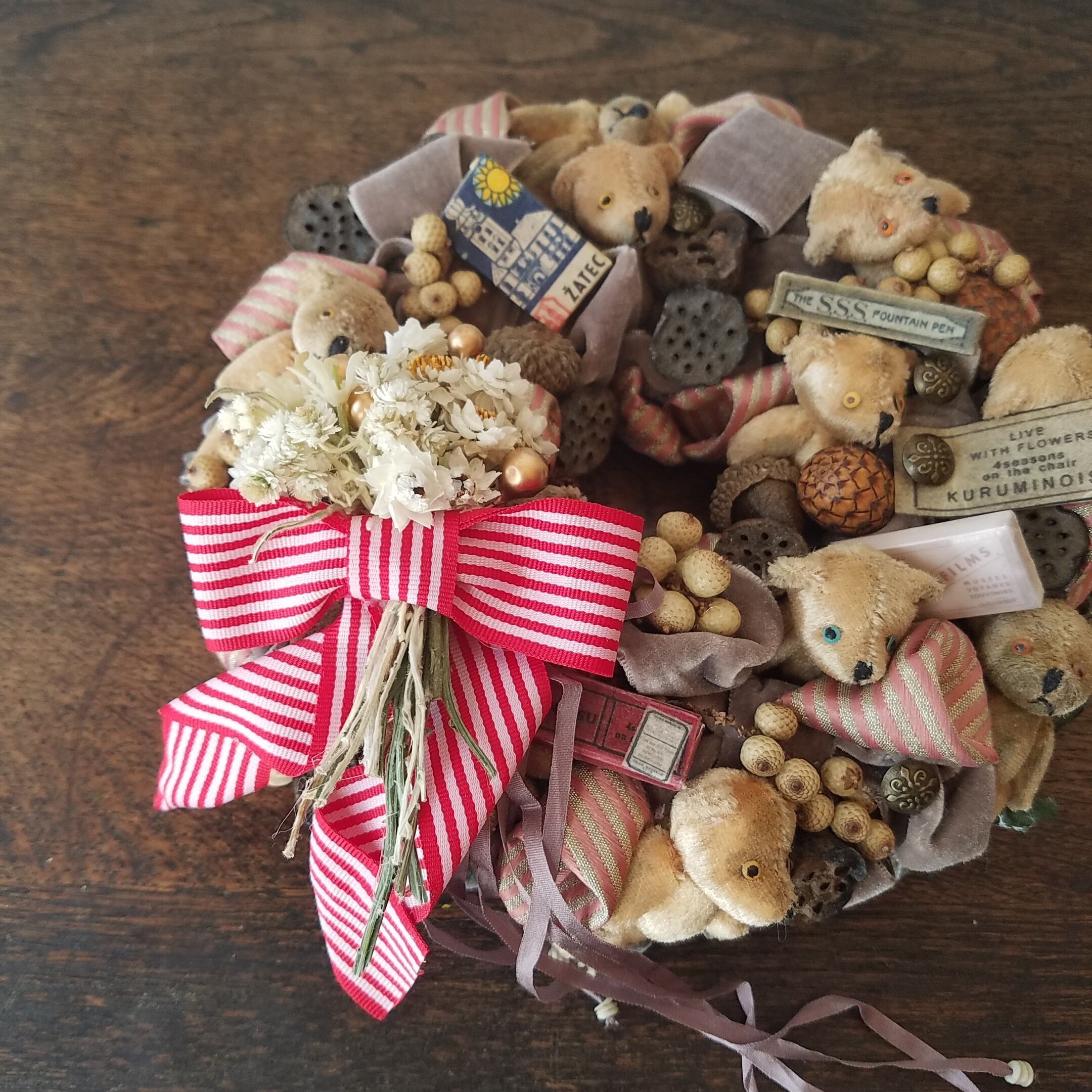 アンティーク風ミニベア、ラタンの実、椿の実殻、蓮の実、ナンキンハゼ、絹のリボン、ミニチュアボックス