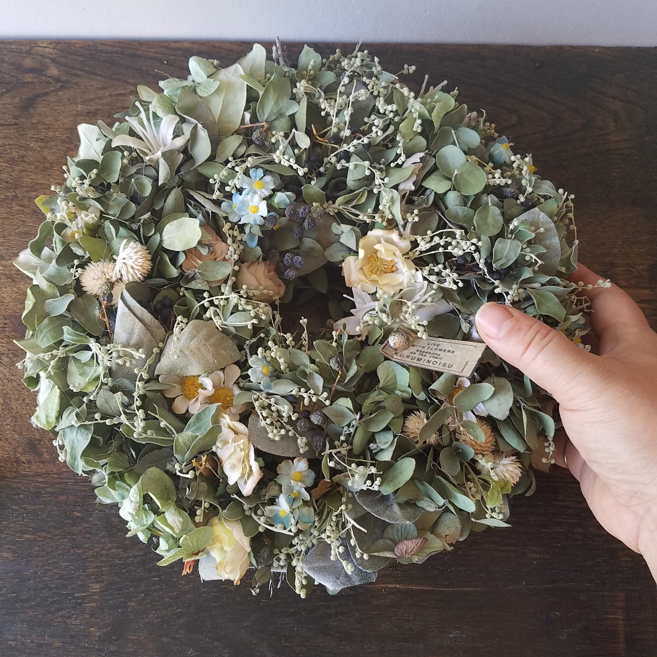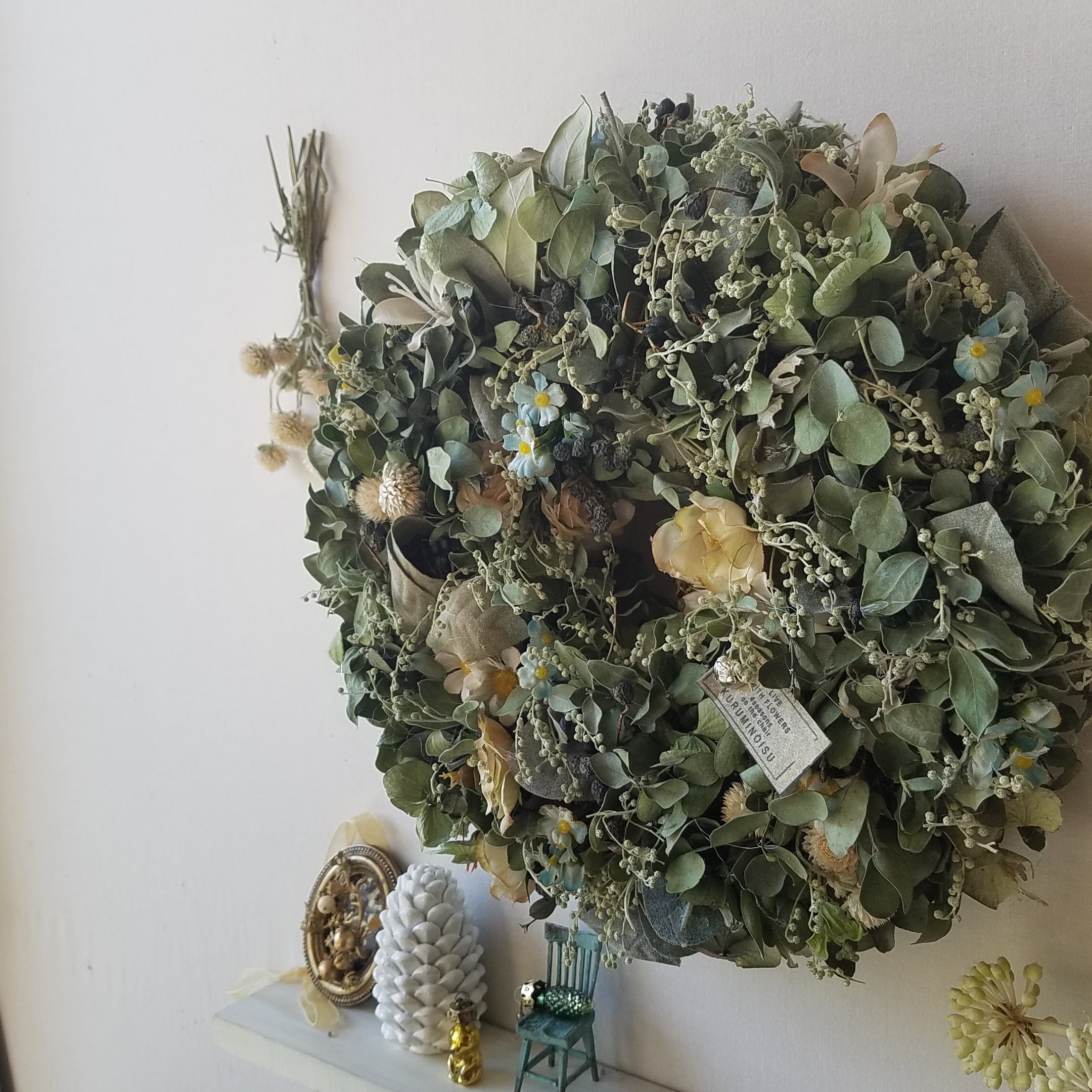 ユーカリ、パールアカシア、フェイジョア、センニチコウ、アンモビウム、ネズミモチの実、造花。
