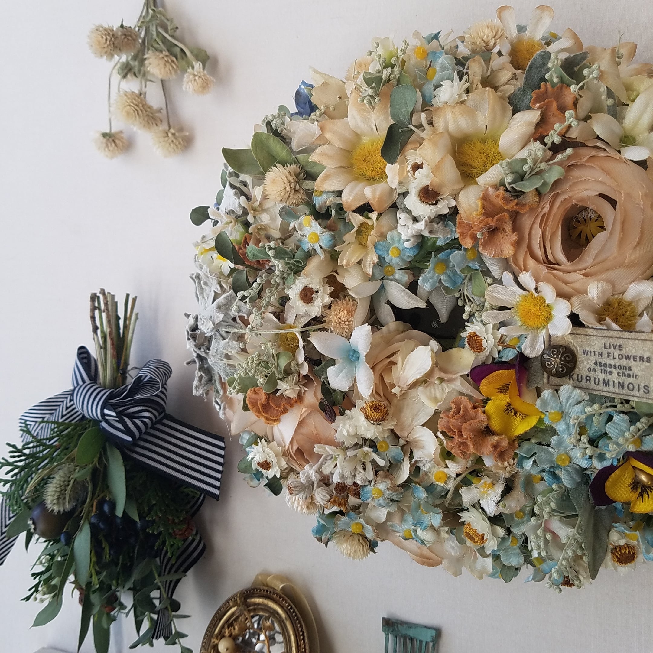 紅茶とコーヒーで染めた造花とドライフラワーのリースです。デザイン上アンティーク風にわざと汚しております。